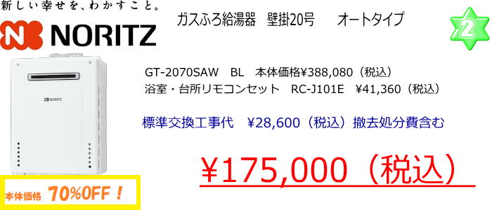 | ノーリツ | GT-2070AW BL | \431,200(税込) | \188,980 |