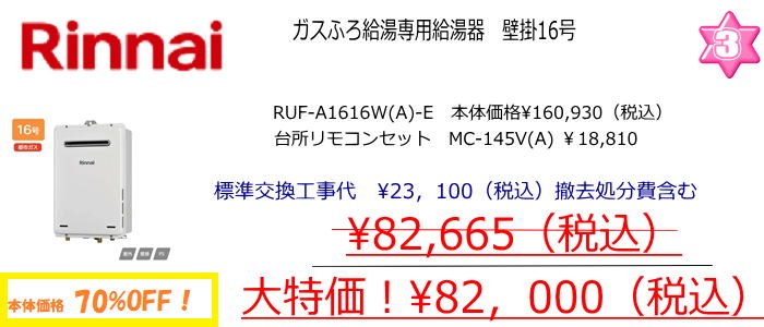 | リンナイ | RUX-A1616W(A)-E | \168,300(税込) | \85,000(オートストップあり) |