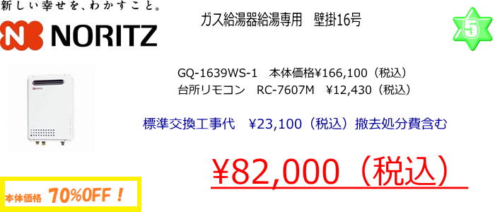| ノーリツ | GT-1639WS-1 | \166,100(税込) | \82,000(オートストップあり) |